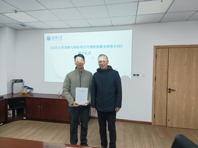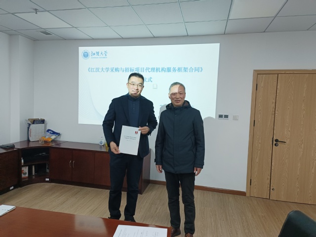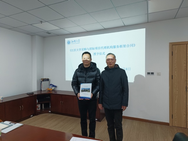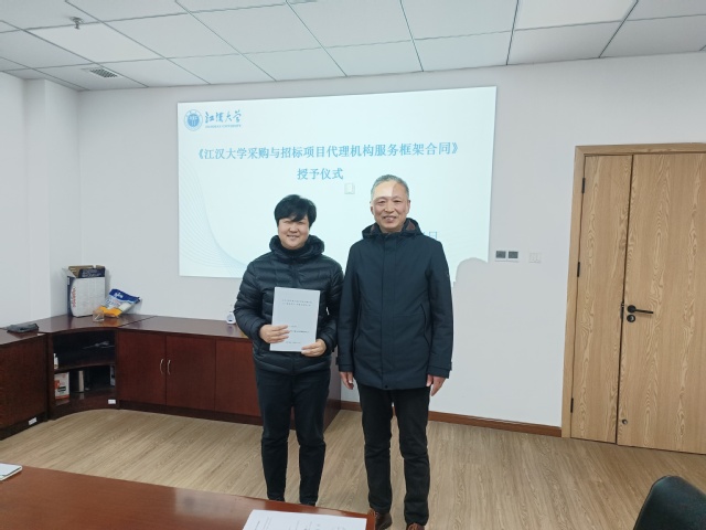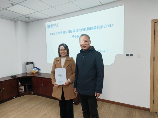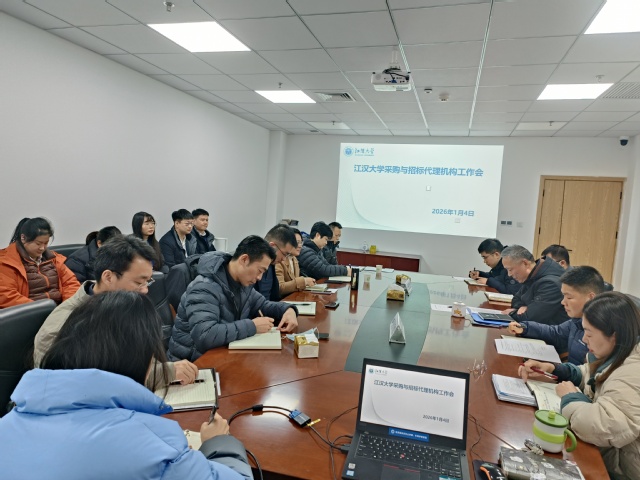 新年伊始,万物焕新。2026 年 1 月 4 日,江汉大学采购与招标代理机构工作会议暨《江汉大学采购与招标项目代理机构服务框架合同》授予仪式于学校师生服务中心327室顺利举行。采购与招投标管理中心全体工作人员会同湖北省招标股份有限公司、湖北省成套招标股份有限公司、湖北中盛汇金项目管理有限公司、武汉恒骥项目管理咨询有限公司、武汉武咨招标代理有限公司、湖北中联太工程造价咨询有限公司共6 家入选代理机构代表齐聚一堂,共同研讨采购招标合作事宜,凝聚发展共识。